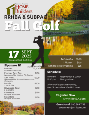 The Roanoke Regional Home Builders Association’s Fall Golf Tournament raises money for our SUBPAC fund to support legislation that impacts the building industry.